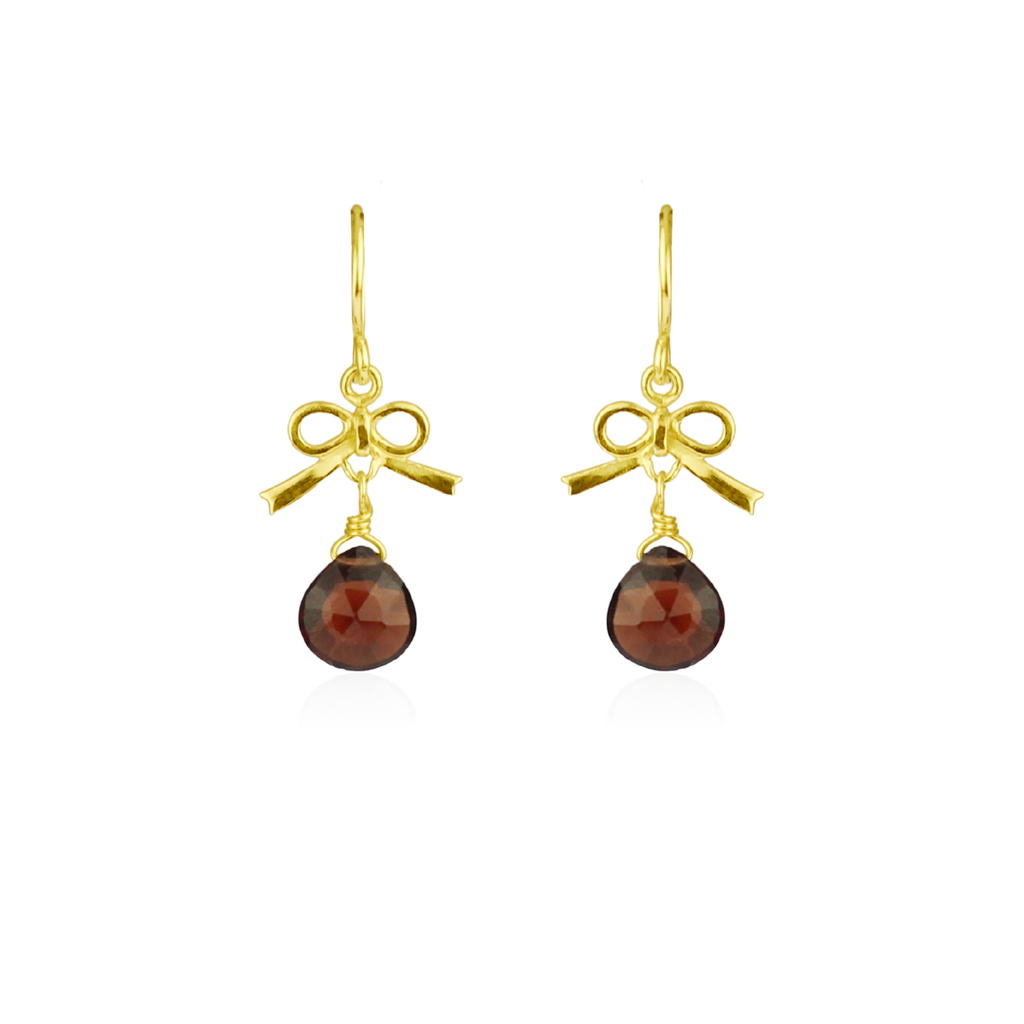 The Tiny Bow and Garnet Drop Earrings feature a delicate bow design paired with pear-shaped garnet briolette. These earrings move subtly with the wearer, enhancing comfort and elegance. The garnet, known for its deep red hue, is often associated with vitality, making these earrings a sophisticated choice for any occasion.