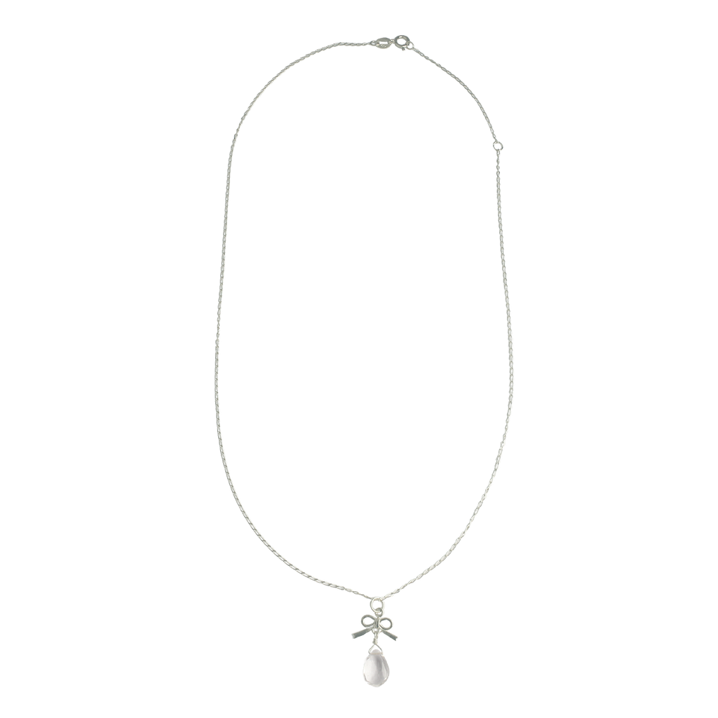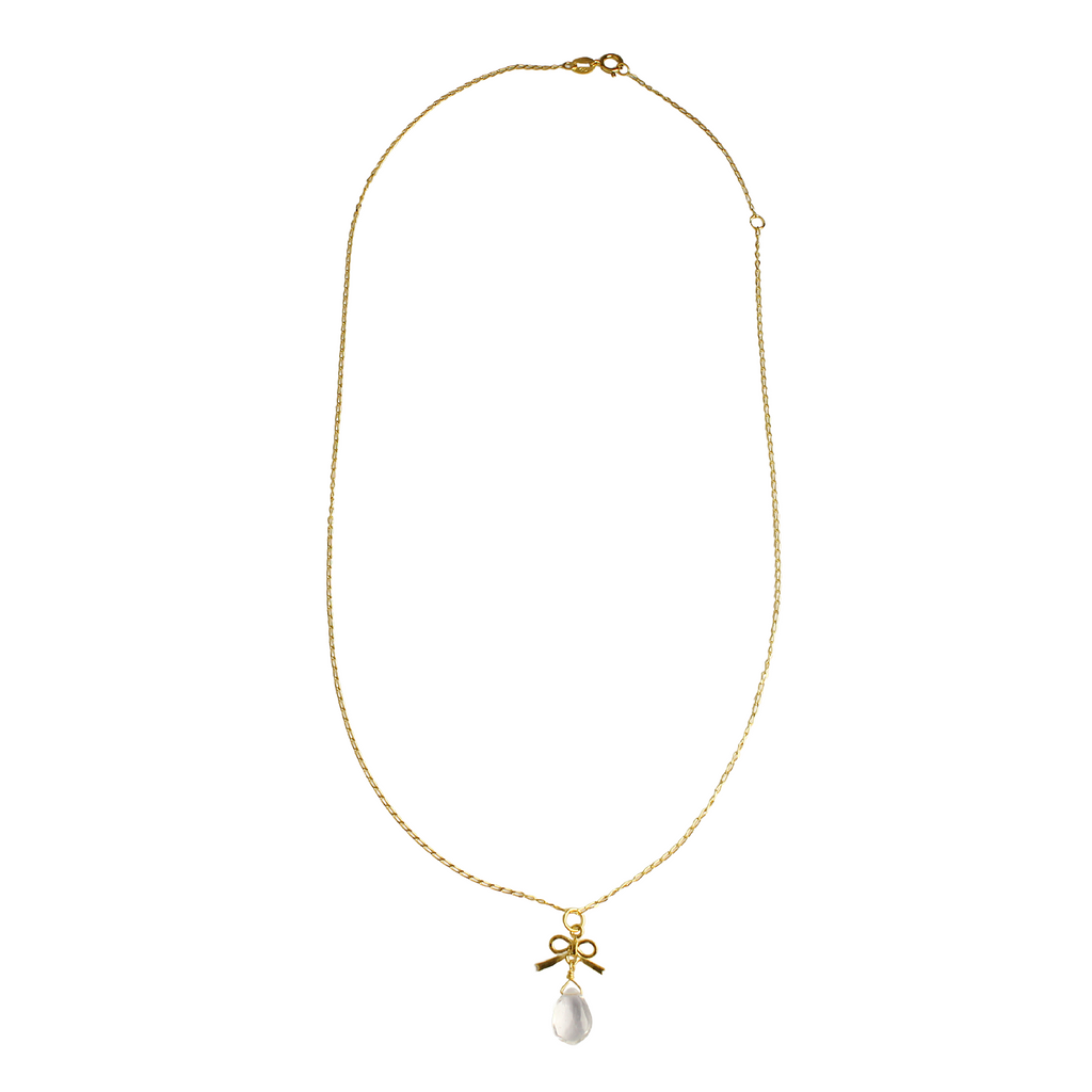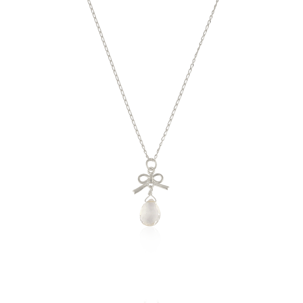 The Tiny Bow Necklace features a delicate bow design complemented by a rock crystal underneath.