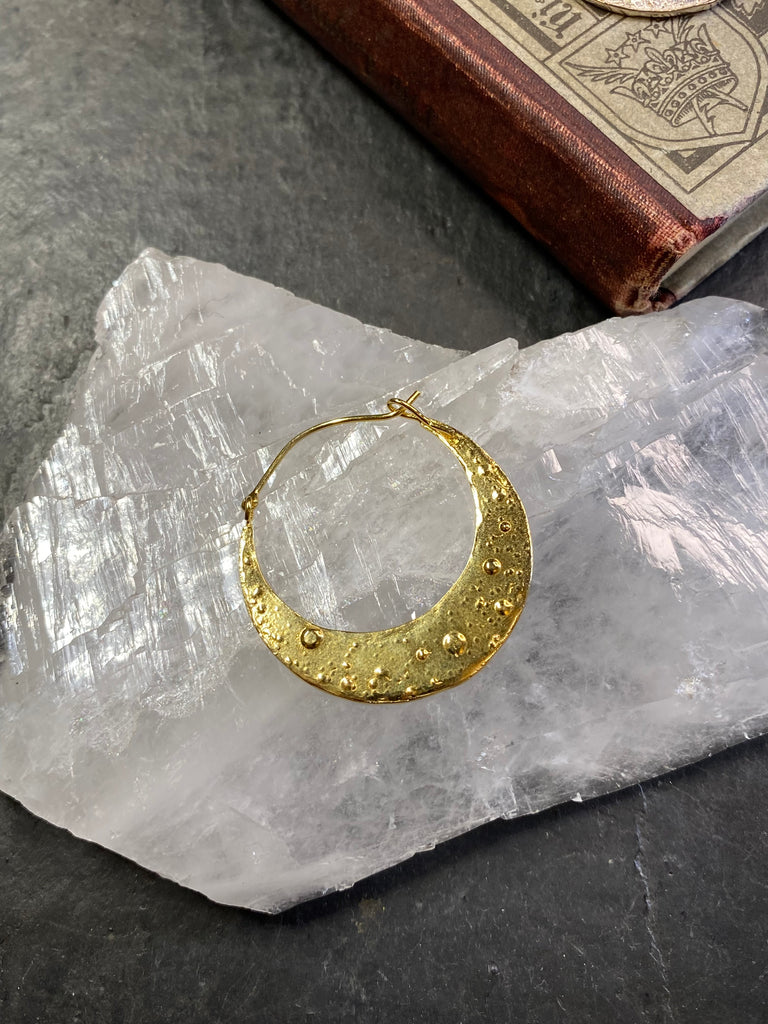 These Large Crescent Moon Hoop Earrings are crafted in recycled silver with a unique texture. At 2 inches in diameter, they make a bold statement while remaining lightweight and comfortable to wear.