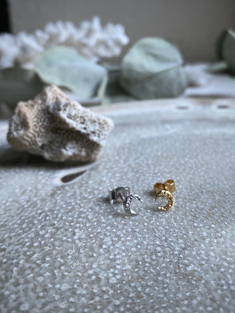 The teeny tiny crescent moon with a texture resembles the moon surface. Perfect for everyday wear and easy to mix-match with other earrings.