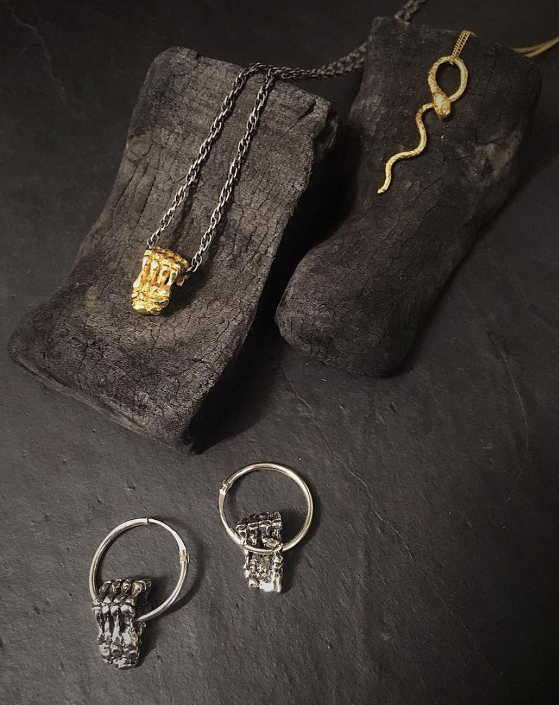 Sculpted skeleton hands grasp each hoop, creating a striking yet refined silhouette. Carefully hand-carved with intricate detail, they transform a classic hoop into a bold, sculptural statement.